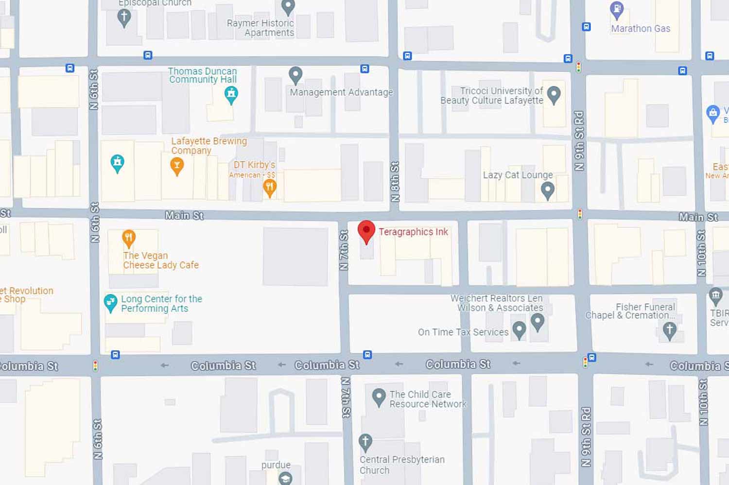 We're located in the heart of downtown Lafayette. Our address is: 701 Main St, Lafayette, IN 47901.
