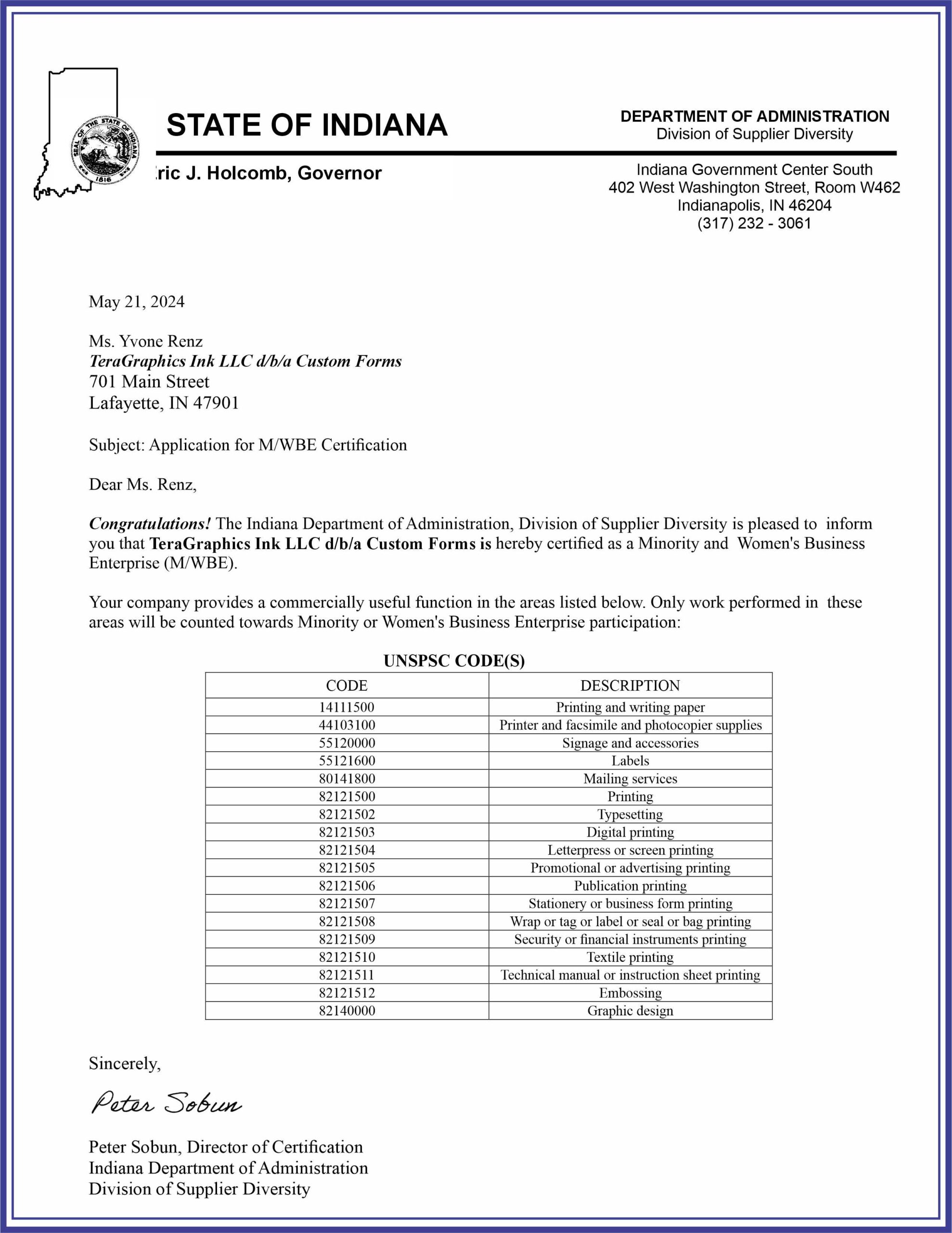 TeraGraphics Ink is a certified Minority and Women Owned Enterprise by the Indiana Department of Administration, Division of Minority and Women\’s Business Enterprises and Mid-States Minority Supplier Development Council (Mid-States MSDC) which is valid in all 50 states and Puerto Rico.